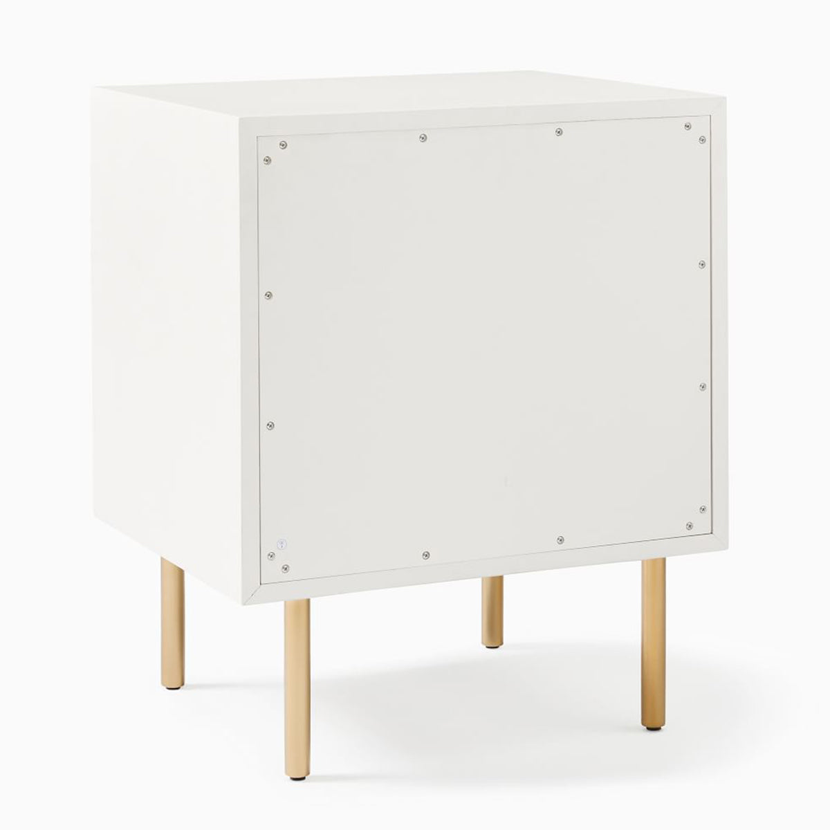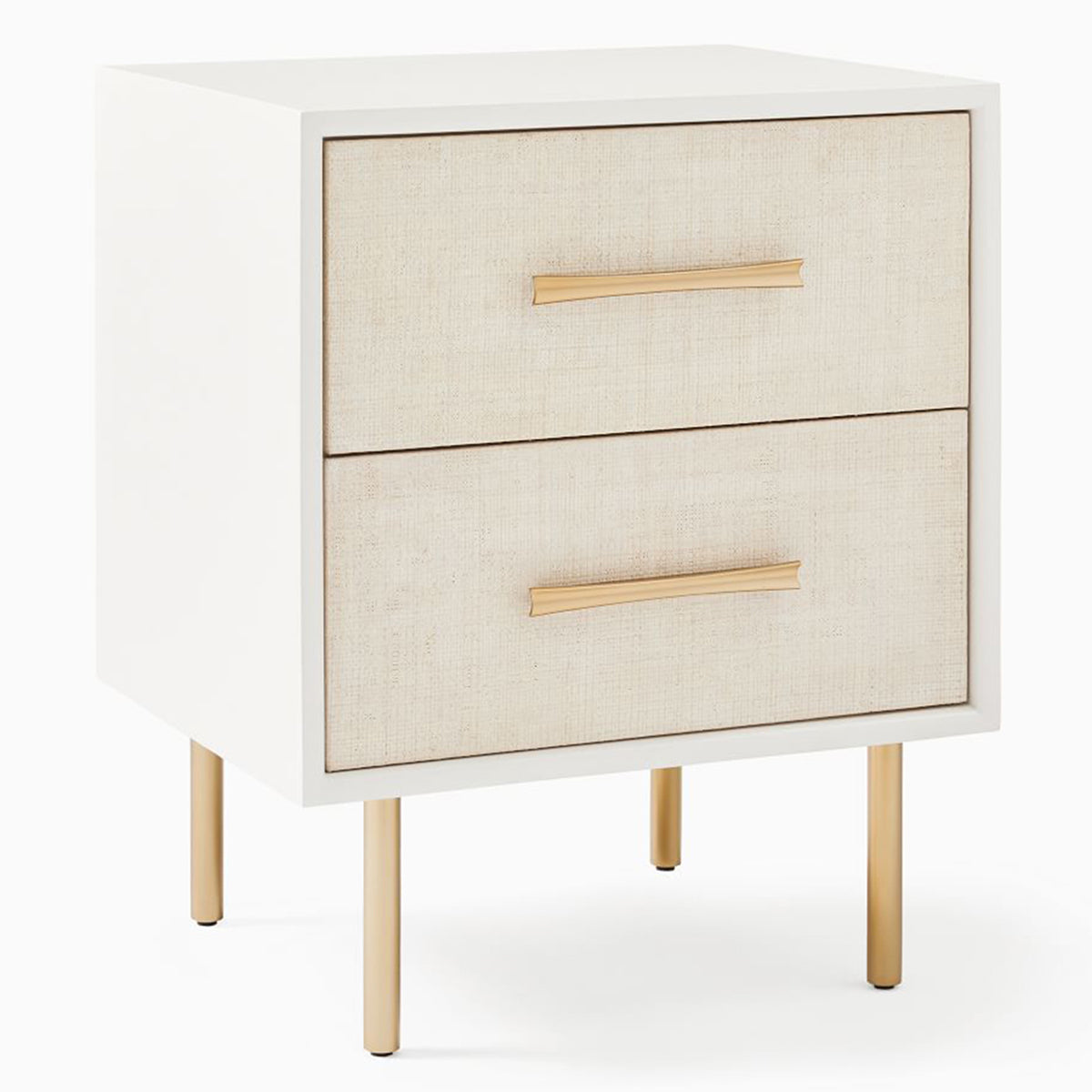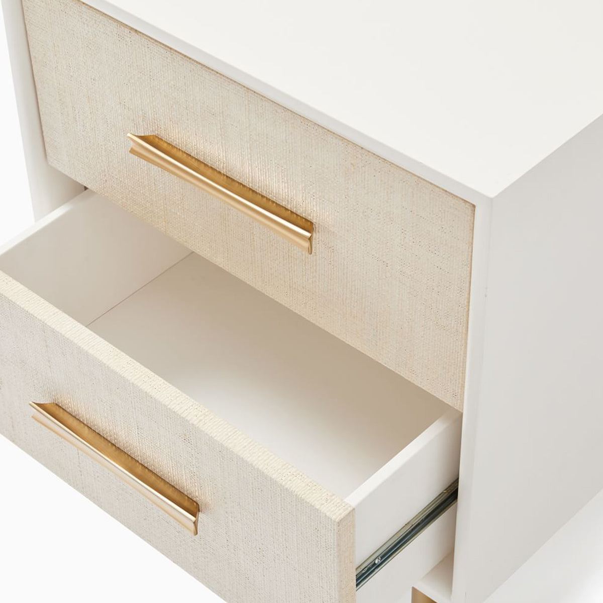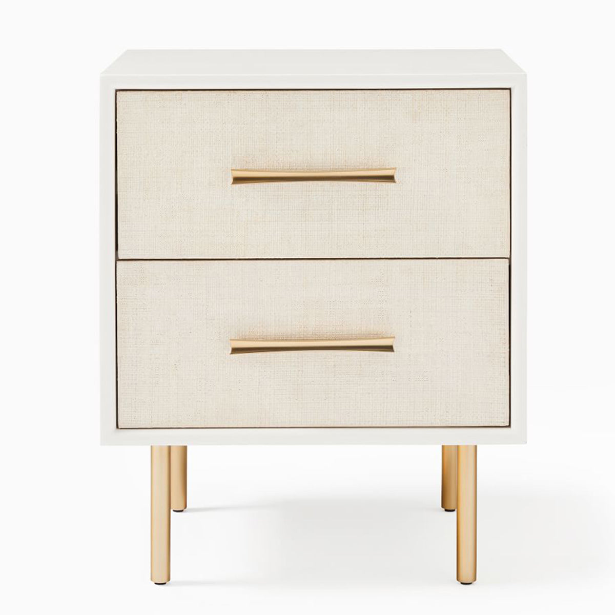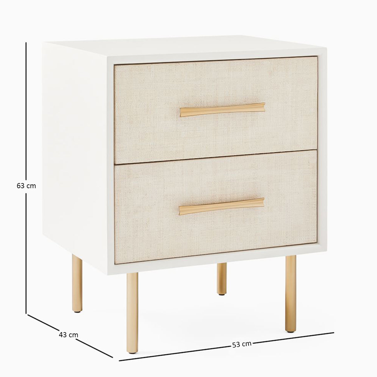 Nachttisch aus Holz mit weiß lackierter Oberfläche und klarer, moderner Silhouette. Kompakte Ablagefläche für Lampe, Buch und Glas; Stauraum für Nachtutensilien. Stabil verarbeitet, bodenschonende Gleiter, pflegeleicht mit einem leicht feuchten Tuch zu reinigen. Passt zu Holz- und Metallelementen und wirkt hell und freundlich im Schlafzimmer.